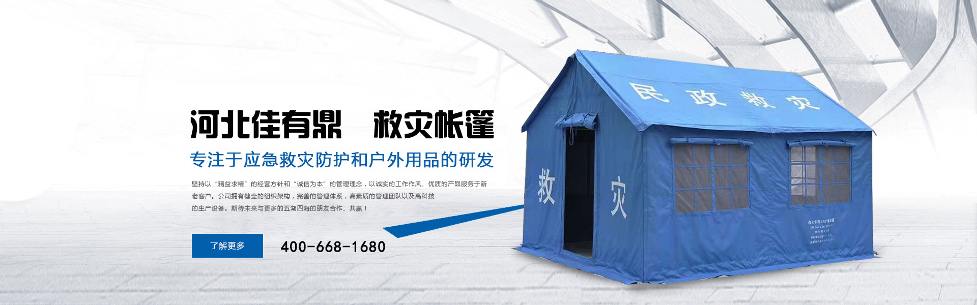 河北佳有鼎科技有限公司原為北京五環(huán)精誠帳篷有限責(zé)任公司多年來專注于應(yīng)急救災(zāi)防護(hù)和戶外用品的研發(fā),是一家集研發(fā)、設(shè)計(jì)、生產(chǎn)、銷售、服務(wù)于一體的綜合型公司。
